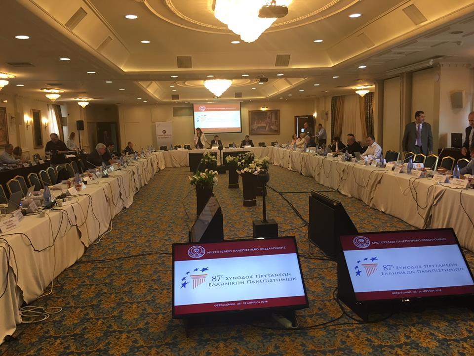 Η 87η Τακτική Σύνοδος Πρυτάνεων και Προέδρων Διοικουσών Επιτροπών των Ελληνικών Πανεπιστημίων διεξήχθη υπό την προεδρία του Α.Π.Θ. και τα θέματα που συζητήθηκαν αφορούσαν, μεταξύ άλλων, τη χρηματοδότηση των ΑΕΙ, τη λειτουργία των φοιτητικών εστιών και τις επιτροπές ερευνών.