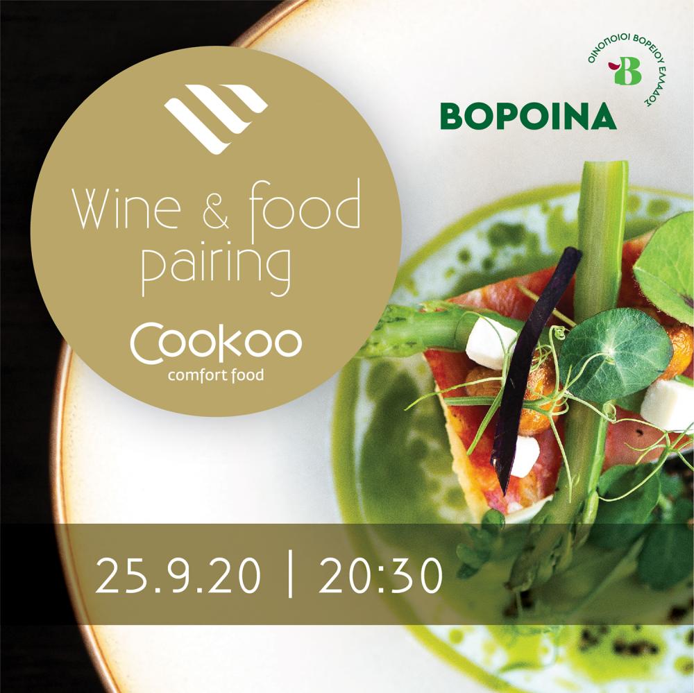 Την Παρασκευή 25 Σεπτεμβρίου στις 20:30, σας περιμένουμε στο εστιατόριο Cookoo για ένα ευφάνταστο «food & wine pairing» δείπνο με 7 διαφορετικές γεύσεις-πιάτα που θα τα συνοδεύσουν 11 κρασιά των ΒορΟινών, από τα ονομαστά οινοποιεία της ένωσης «Οινοποιοί Βορείου Ελλάδος».